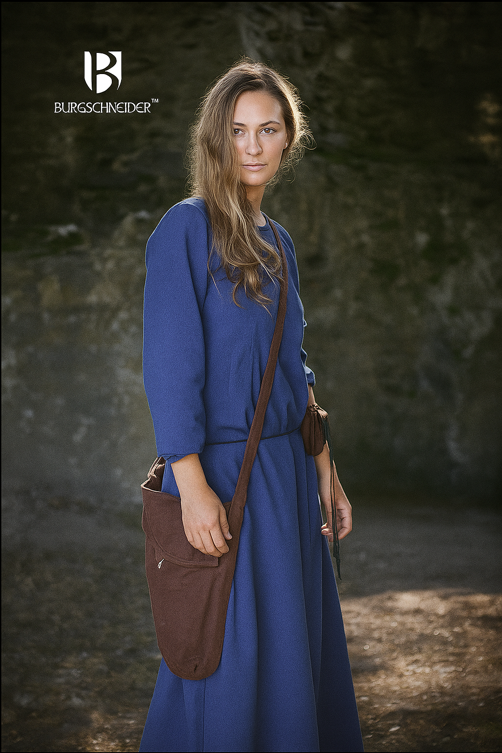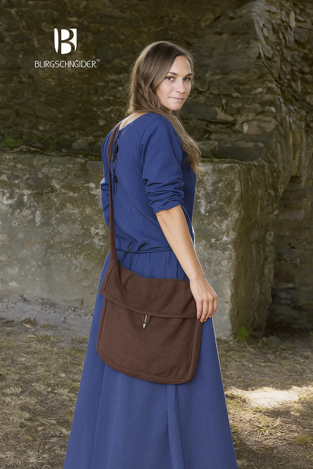 Den långa axelremmen och det rustika tyget förstärker den medeltida karaktären och gör den idealisk för historiska tillställningar eller för den som vill ha en unik vardagsväska med karaktär.