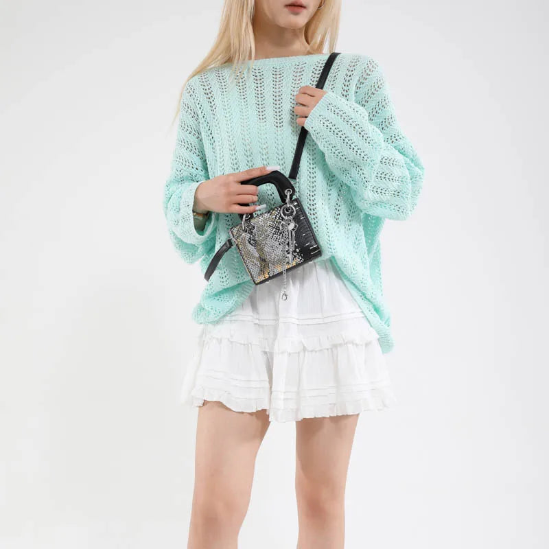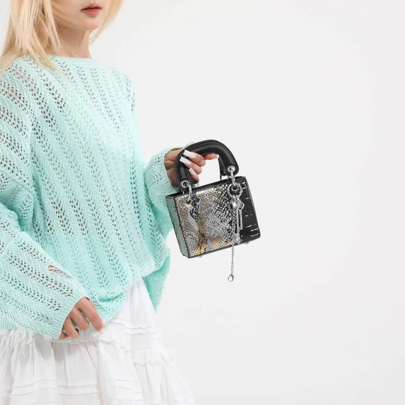 Denna klassiska mini-handväska i lyxig serpentin-design är ett måste för varje modest medveten garderob. Perfekt storlek för det viktigaste – telefon, kort, nycklar – och med sina glansiga detaljer och dekorativa nyckelringar blir väskan både en accessoar och ett statement.