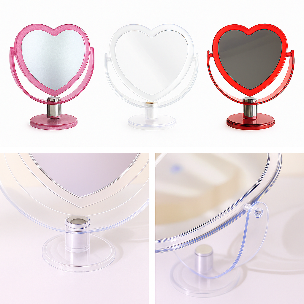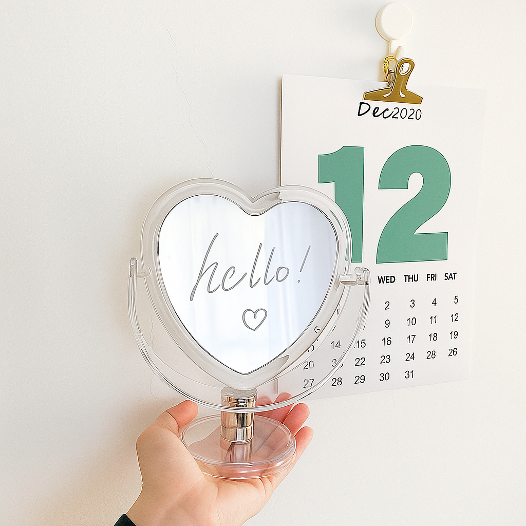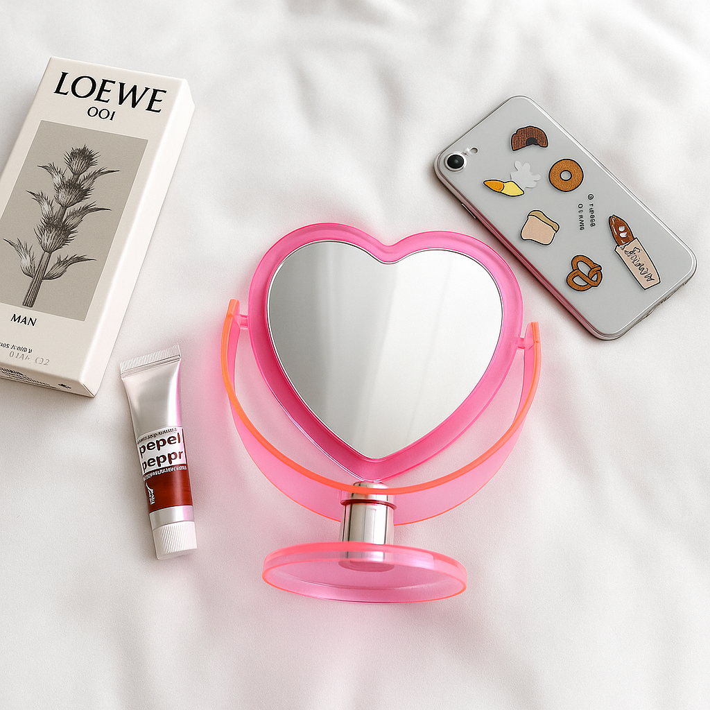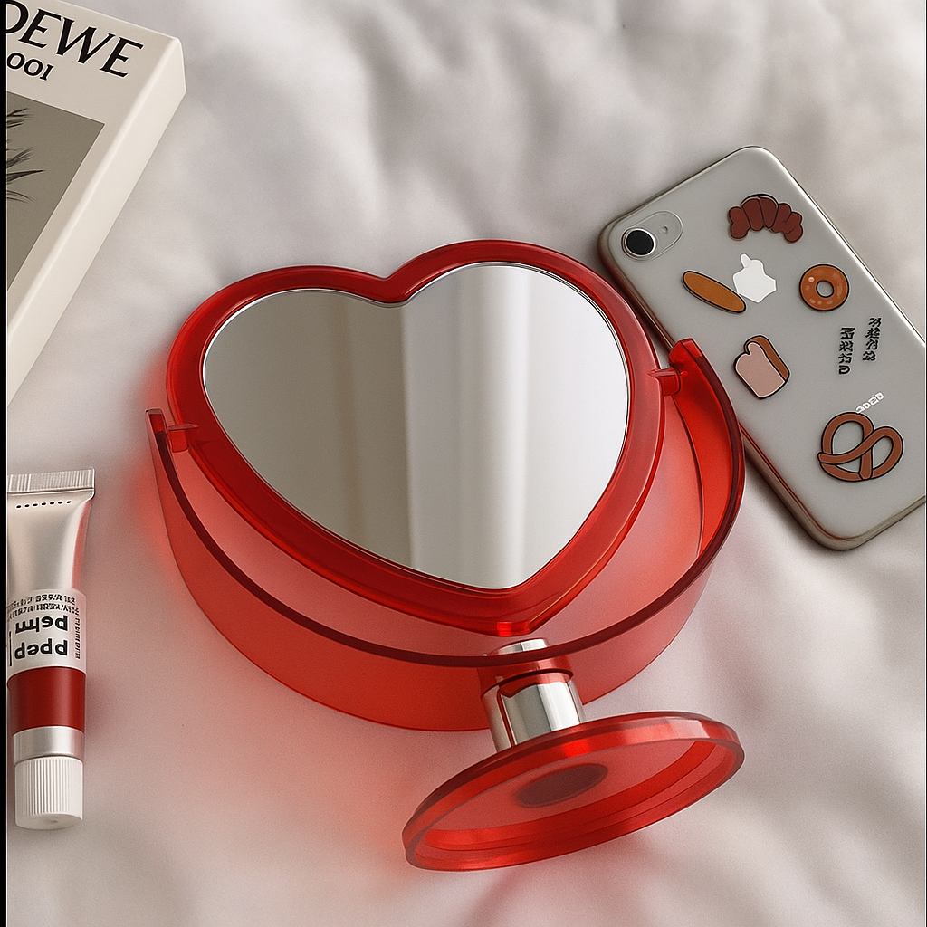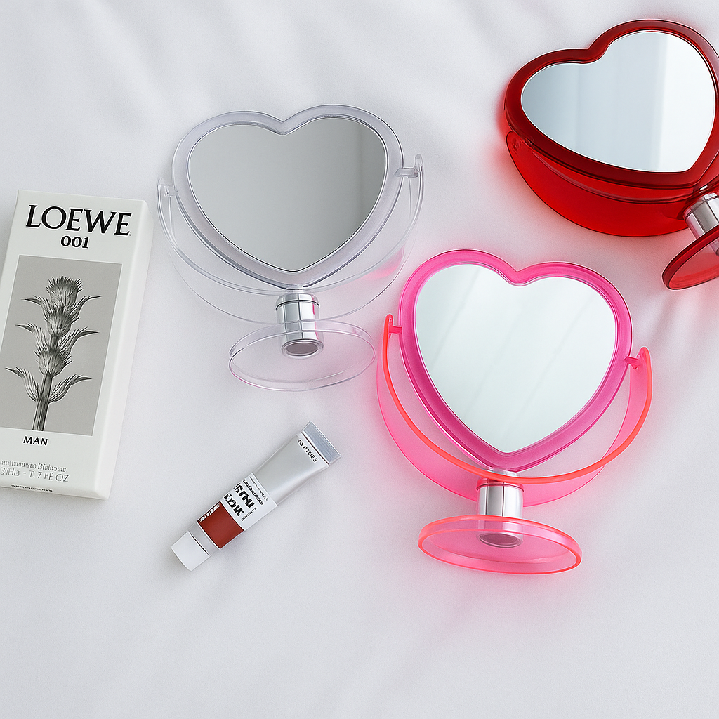 Hjärtformad Sminkspegel i Akryl – Dubbelsidad Spegel med Transparent Bas i Koreansk INS-Stil